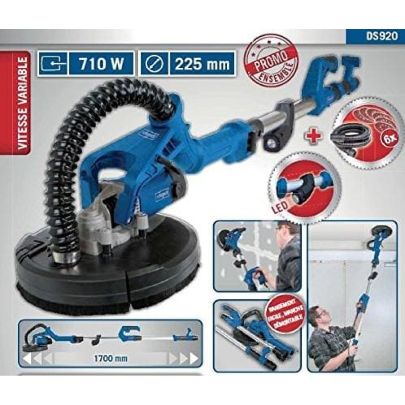 | Jauda: 710 W Apaļš smilšpapīrs Ø: 225 mm Diska rotācijas ātrums: 700 – 1700 Putekļu savācēja iekšējais/ārējais Ø: 45 mm/50 mm Motors: 230 – 240 V~ Izmēri G x P x A: 1200 – 1700 x 270 x 260 mm Svars (neto): 4,5kg Scheppach DS 920 ģipškartona slīpmašīna ir sienu un griestu apstrādei ideāli piemērots instruments. Smilšpapīra galva sasveras uz nepieciešamo pusi, tāpēc ir vieglāk paveikt visus darbus, apstrādājot gan sienas, gan griestus. Ar teleskopisko rokturi aprīkotais DS 920 ir viegli transportējams un uzglabājams. Regulējams ātrums optimālai dažādu virsmu slīpēšanai. 225 mm slīpēšanas virsma, kas ļauj apstrādāt lielus laukumus. Slīpēšanas diski ir viegli piestiprināmi, izmantojot līplentes stiprinājuma sistēmu. | ||||||||||
